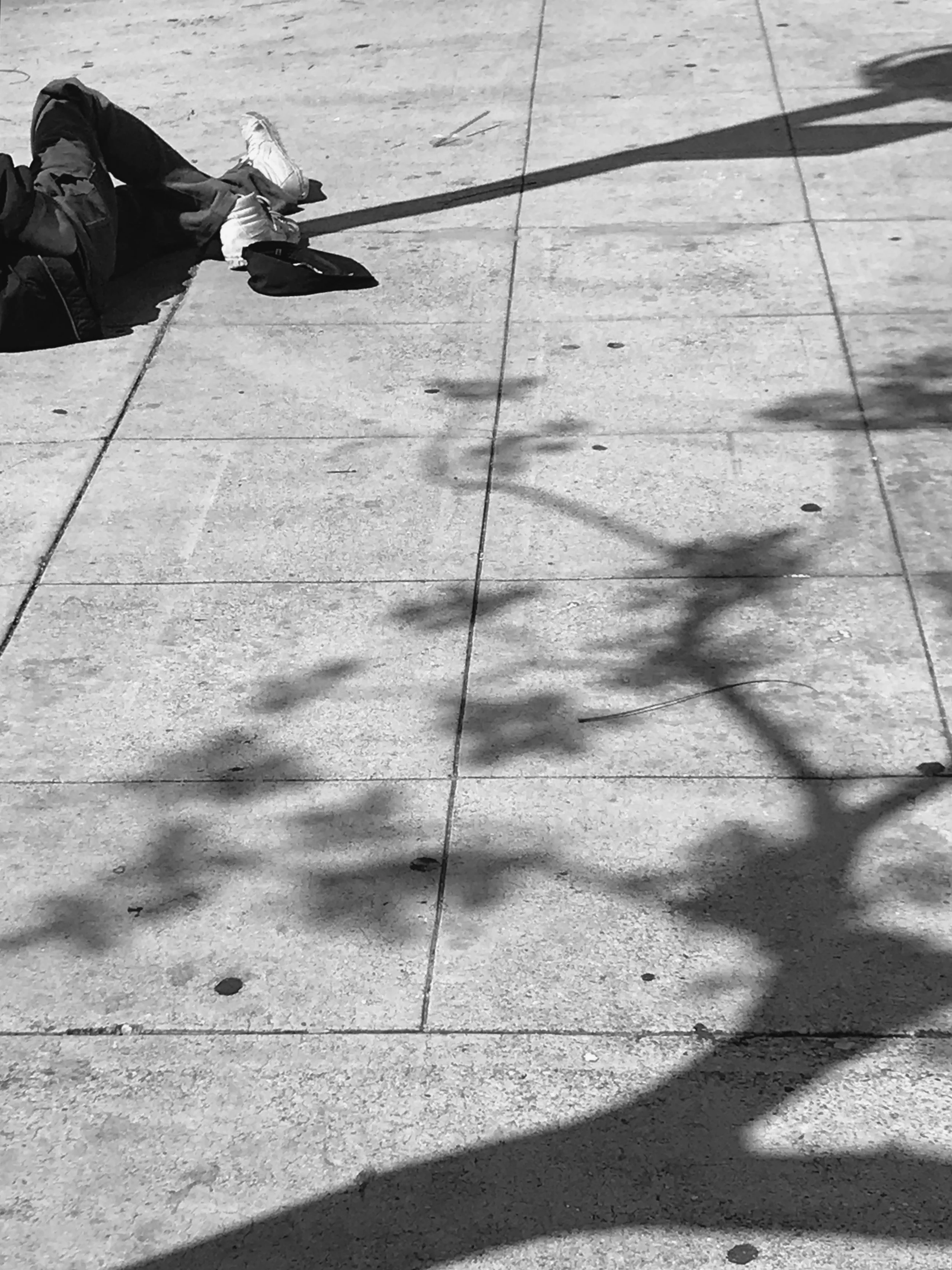 I had become more and more attracted to the tragic issue of people living on the public streets when it occurred to me that, not only is this an increasing circumstance in our time, but one that has also, in its pervasive way, become a more socially interactive phenomenon. People who had nowhere else to sleep would, in the past, tend to dwell in alleyways or less visible spaces, but now often inhabit spaces more openly – on the public streets, at any time. In my community, there are no tented enclaves, rather homeless people will just settle, in a way establish residence, on the open walkway where they, at any moment, happen to be.